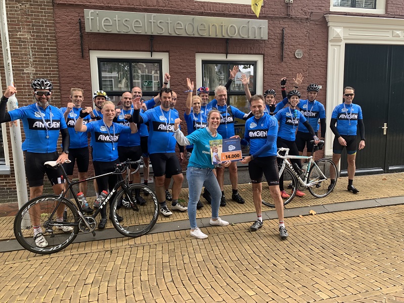 Breda, 14 september 2022 – Vorige week overhandigde Amgen een cheque van € 14.000,- aan Stichting Matchis. Deze stichting zorgt ervoor dat patiënten met een vorm van bloedkanker, die een stamceltransplantatie moeten ondergaan, zo snel mogelijk de best passende niet-verwante donor krijgen. Het bedrag werd bij elkaar gefietst door 17 Amgen medewerkers, die de “Fietselfstedentocht” reden. Een aantal Amgen collega's stond op het Marktplein in Bolsward, de start- en finishplaats van deze tocht, om het gesprek aan te gaan over stamceldonatie. Amgen organiseert elk jaar, tijdens de bloedkankermaand in september, speciale acties om Matchis te steunen.
